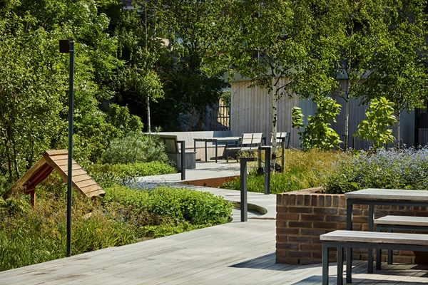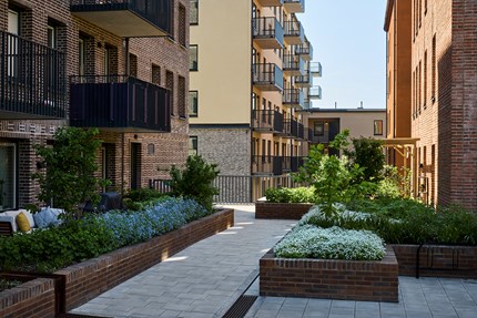 Husens gestaltning är karaktärsfull med fasader i skiffer, härliga gemensamma terrasser mellan husen och högt läge med vyer åt flera håll. Kvarteret blev framröstat av Nackaborna till 2023 års stadsbyggnadsutmärkelse.
